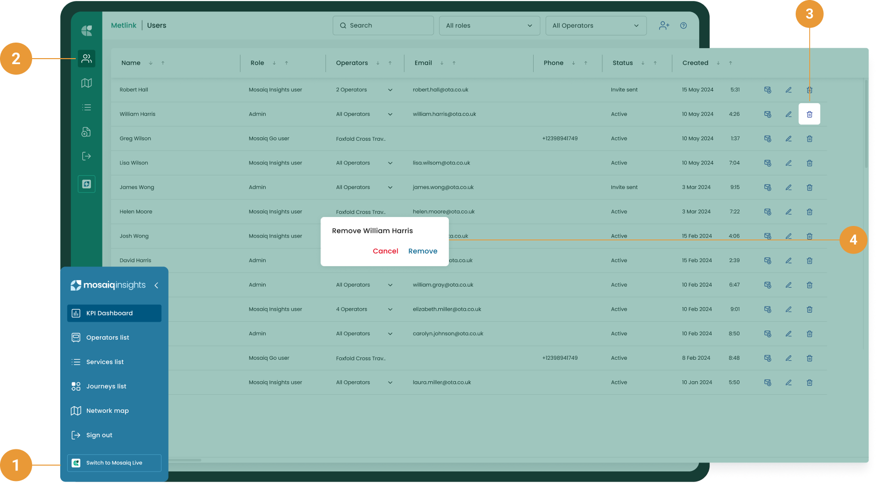 Locate the user you wish to delete and click delete to the right of their row (3).