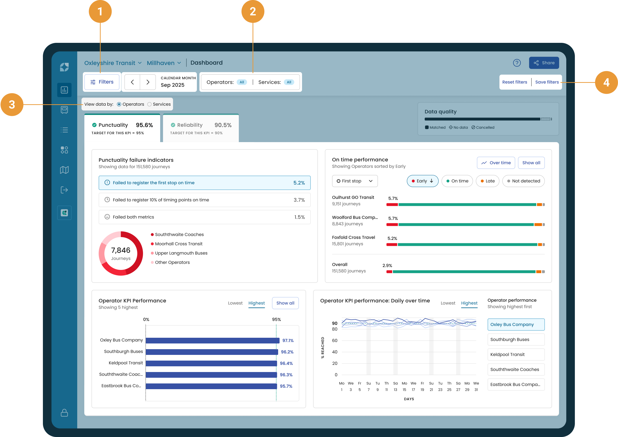 Click on either the filter hub or operators/services button to select which operator/s and service/s to include (2), and toggle how you want to view the data you’ve selected on the dashboard – either by operators or services (3).