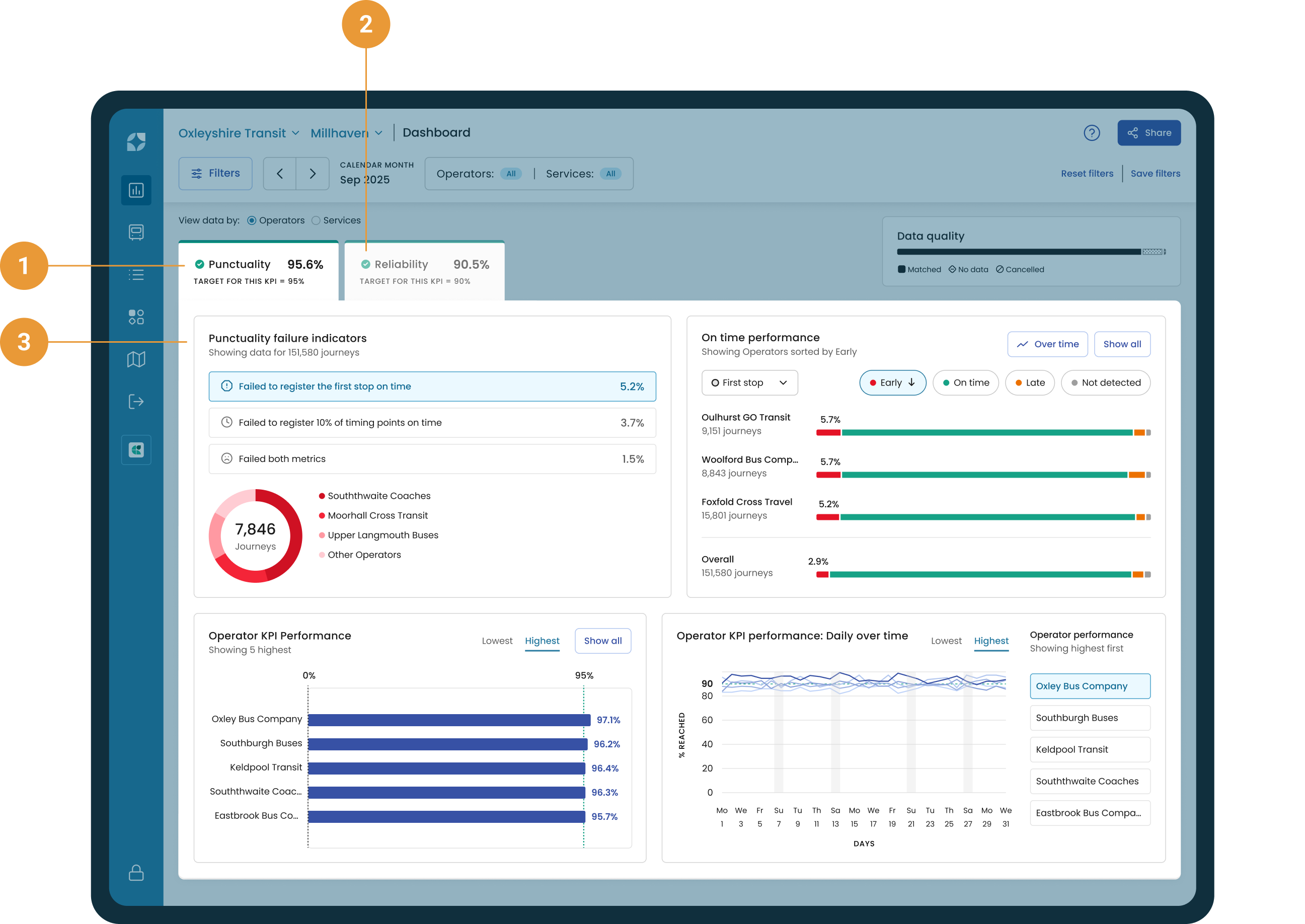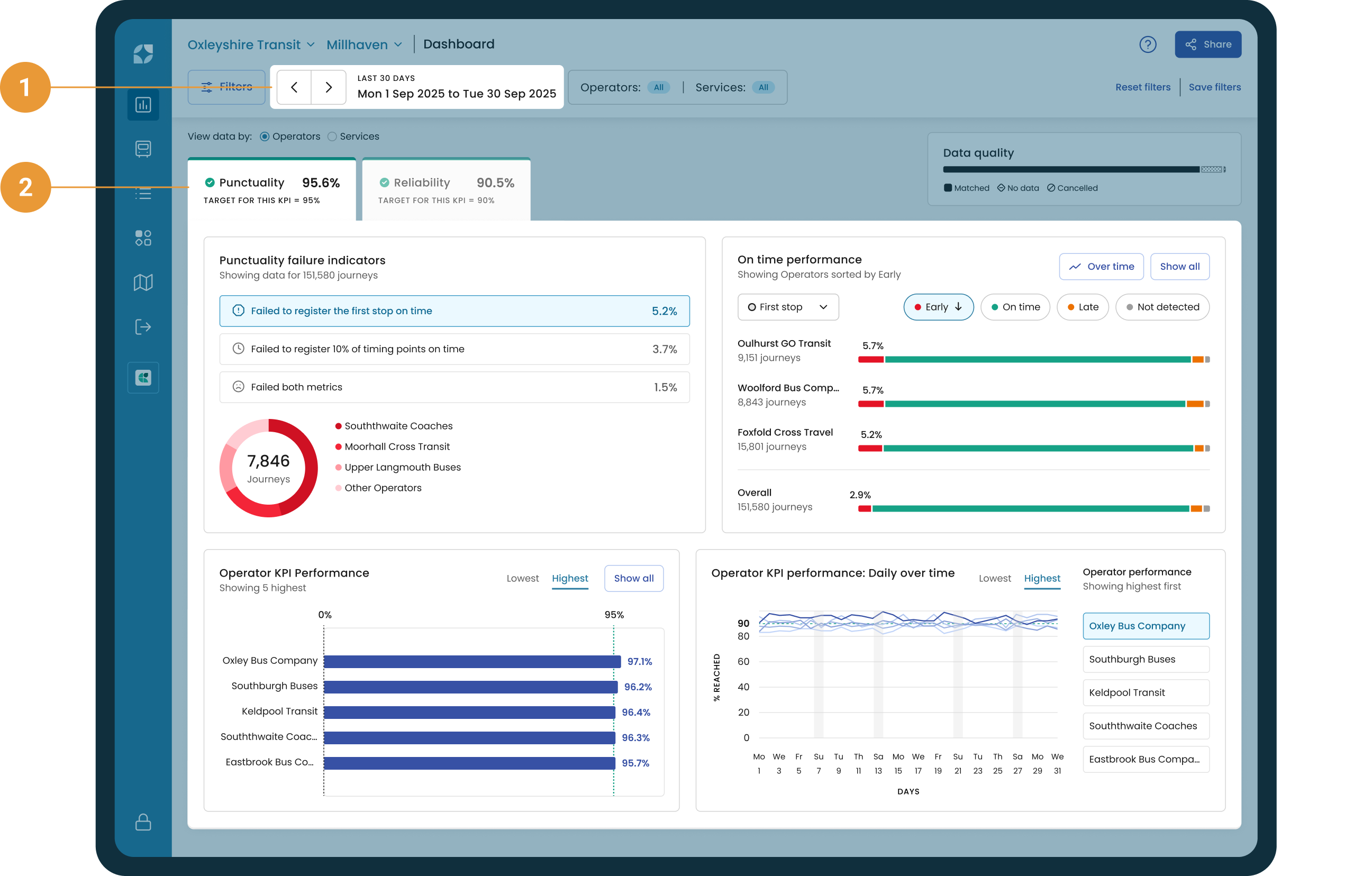 The KPI results for all selected operators are divided into two tabs – Punctuality (1) and Reliability (2).